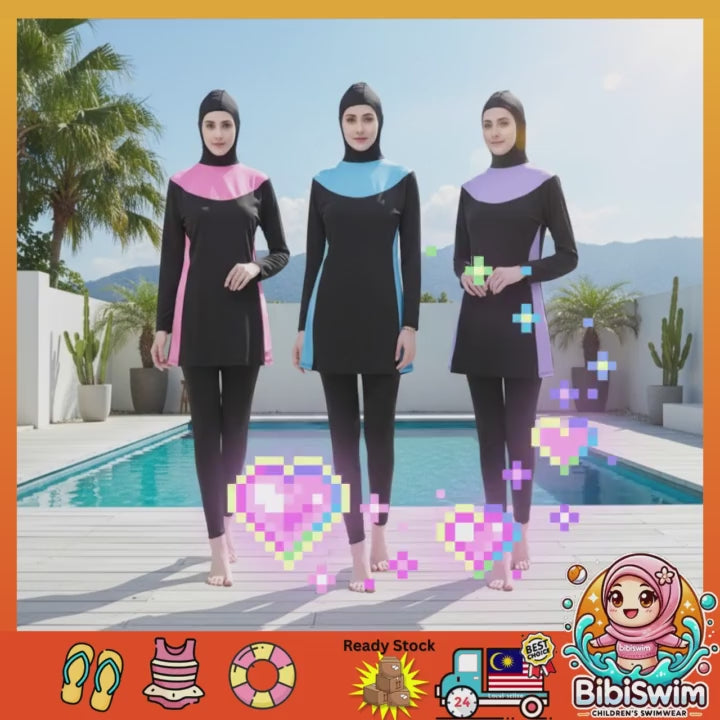 Designed for Muslimah women who love swimming while keeping modesty and comfort. This two-piece swimwear features a long-sleeve top, hooded design, and full-length bottom — giving you the perfect blend of elegance and coverage. 🌊