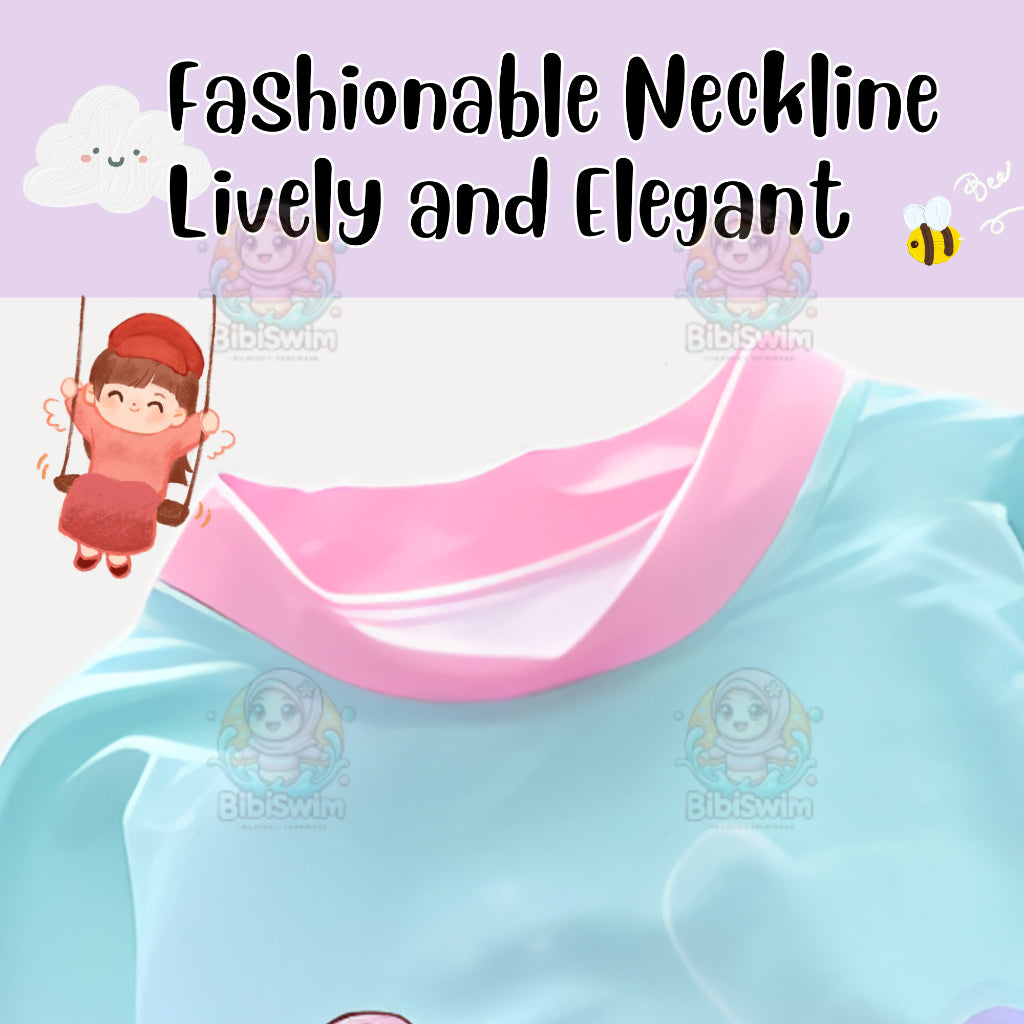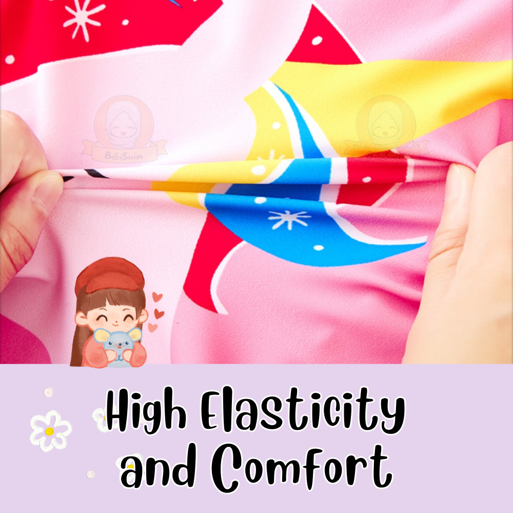 The material of this swimsuit is treated with UPF50+ sun protection, it can protect your kids skin by blocking UV rays. The fabric are smooth and comfortable, and not deformed, not faded. When your daughter wear this swimsuit, it won't squeeze the neck, and also will be tight to the body when swimming, not loose. 🤩